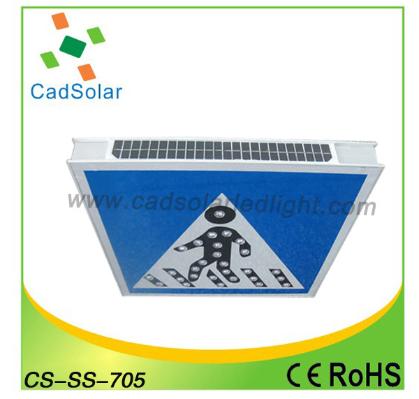 太阳能交通标志是交通标志牌的一种,由标志面、标志底板、太阳能电池板、控制器、发光单元(LED)组成,用文字与图案传递警告、禁令、指示信息给司机和行人,用以管理道路交通的安全设施。白天太阳能电池板吸收太阳光,把太阳能转化成电能,储存在储能器件中,到了晚上,储能器件中的电能自动转化成光能(通过光电开关控制),通过LED发出亮光来勾画图案轮廓,传达交通信息。它给道路使用者以确切的道路交通信息,使道路安全畅通,事关司机和行人的生命财产安全,是一种不可缺少的交通安全附属设施。