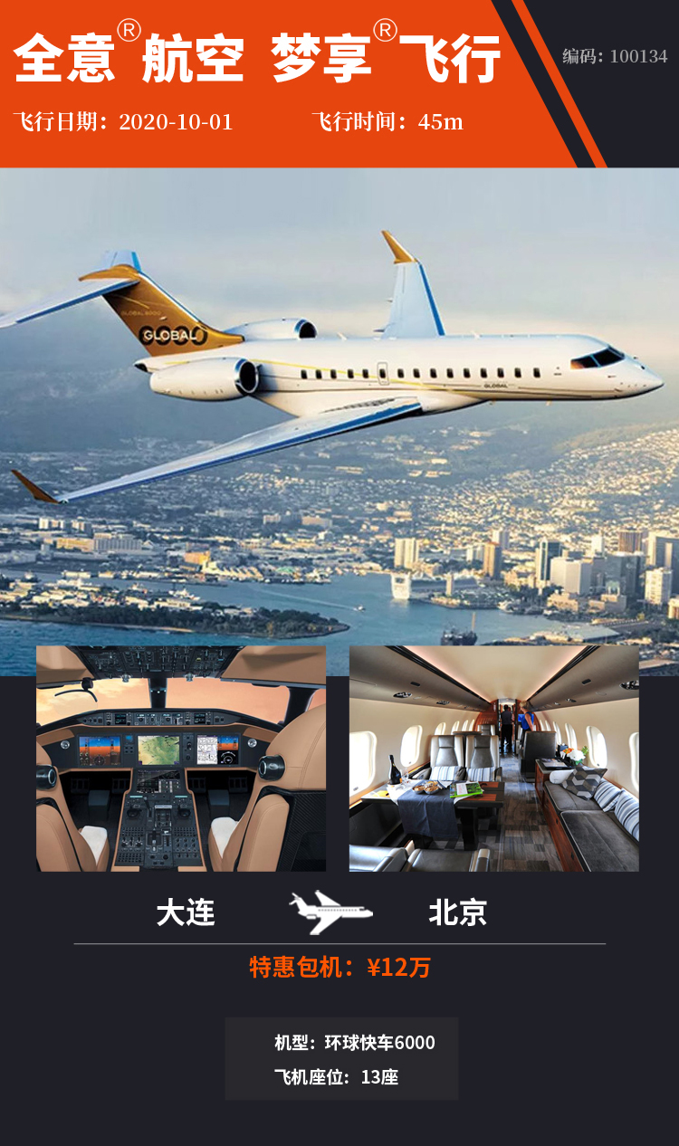 机型环球快车6000 13座位 2020年-10月01日起飞 全意航空 梦享飞行