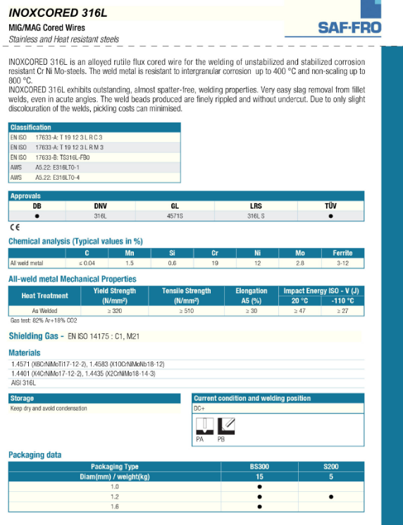 法国沙福INOXCORED 316L不锈钢药芯焊丝 E316LT0-1 -4进口焊丝